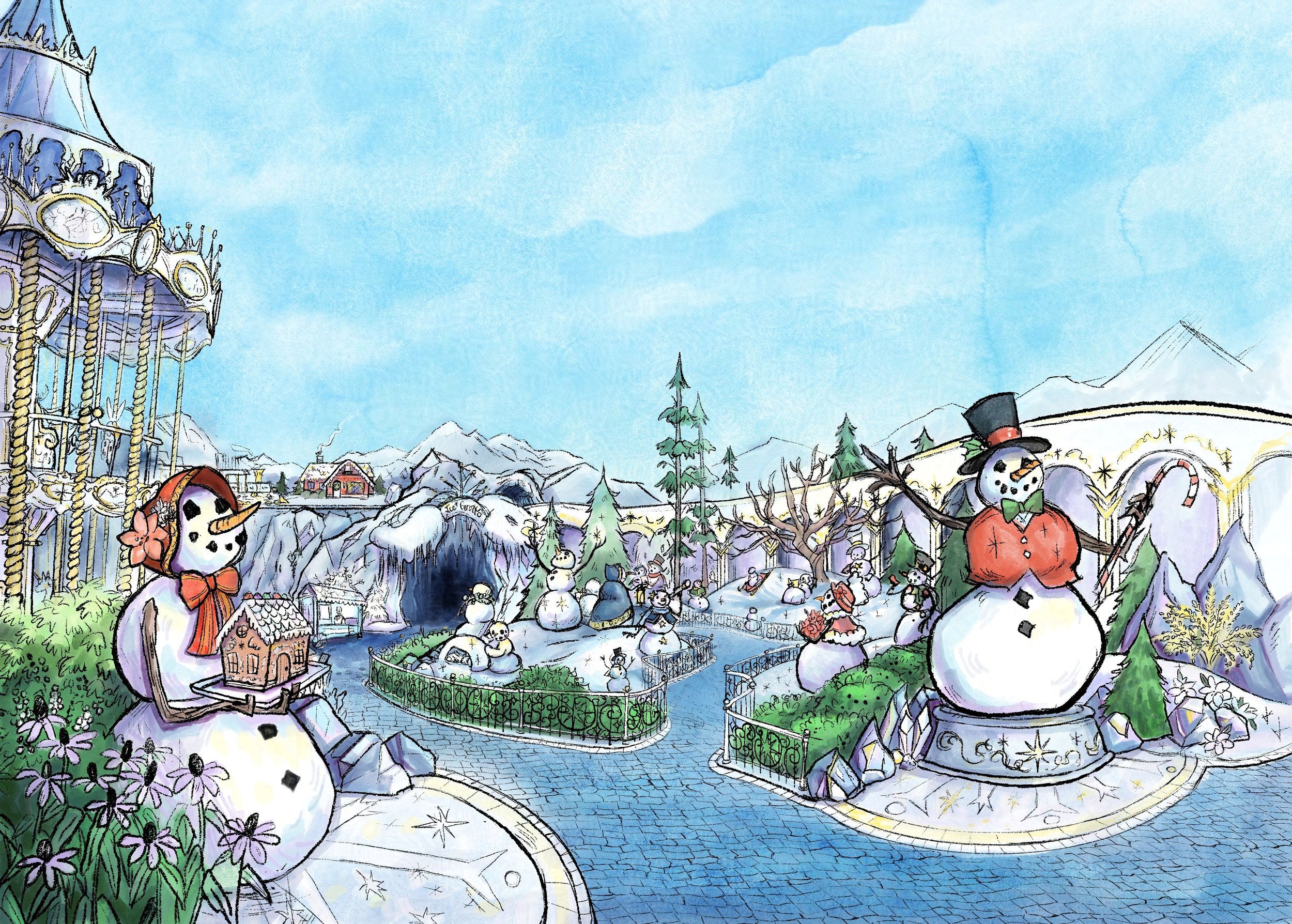 Santa’s World (name tbd) is a Christmas/Winter Holiday theme park, created with various tellings of “Santa” in mind. I’m writing a children’s book to go along with it (first draft complete)! More info and images to be added as I have time. Wanted to merge a children’s book style with my theme park style and see what happens - haven’t reached that part yet! These are the first couple of illustrations, exploring style, etc. (2019-2024)